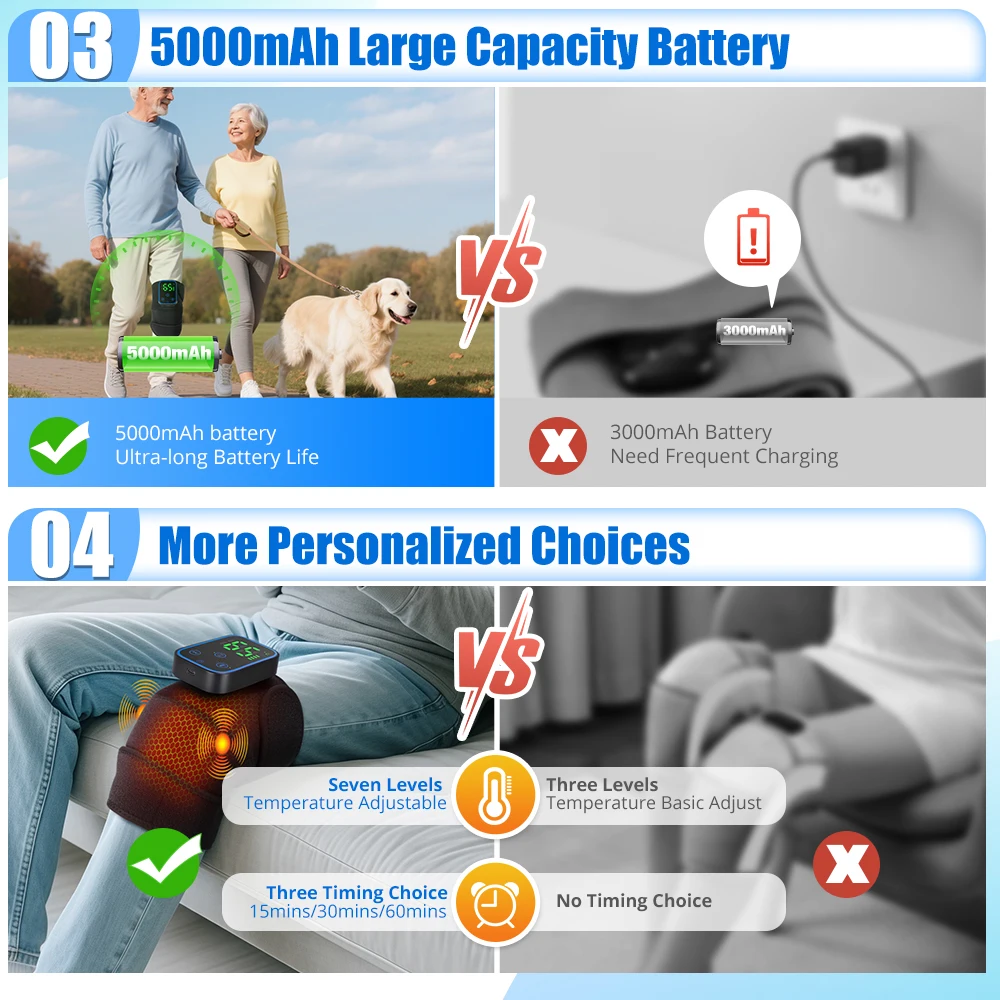 4.Bateria de lítio recarregável de alta capacidade de 4000mAh integrada, esta joelheira suporta uso sem fio, para que você possa desfrutar de uma massagem confortável a qualquer hora e em qualquer lugar.